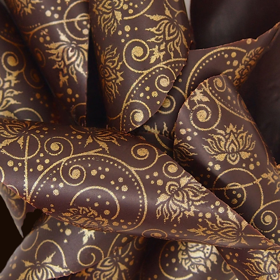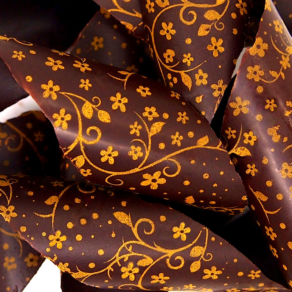 Beautiful chocolate designs on dark and white chocolate, to be used as accents for desserts and chocolate truffles.